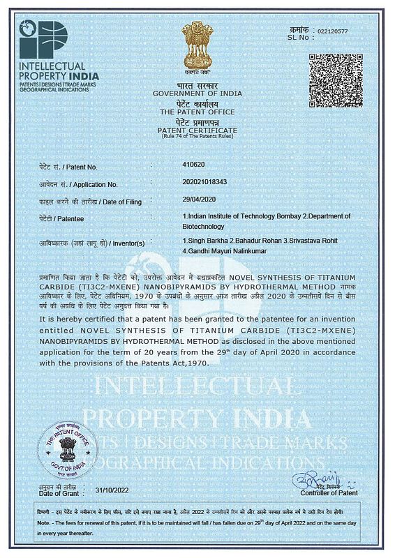 Barkha Singh, Rohan Bahadur, Mayuri Gandhi, Rohit Srivastava. “Novel Synthesis of Titanium Carbide (Ti3C2-MXene) Nanobipyramids by Hydrothermal Method'' Patent granted: 410620, November 2022.