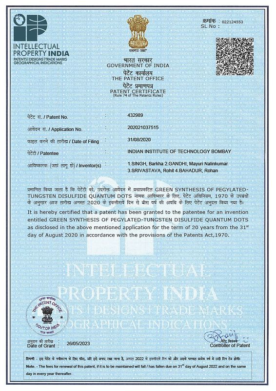 Barkha Singh, Rohan Bahadur, Mayuri Gandhi, Rohit Srivastava. Green Synthesis of PEGylated-Tungsten Disulfide Quantum Dots, Patent granted: 432989, May 2023.