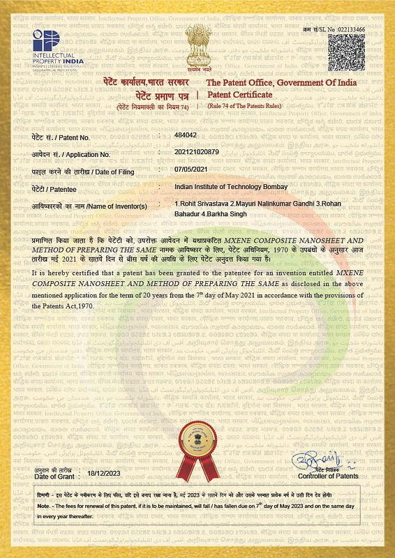 - Barkha Singh, Rohan Bahadur, Mayuri Gandhi, Rohit Srivastava, MXene composite nanosheet and method of preparing the same, Patent Granted: 484042, December 2023
