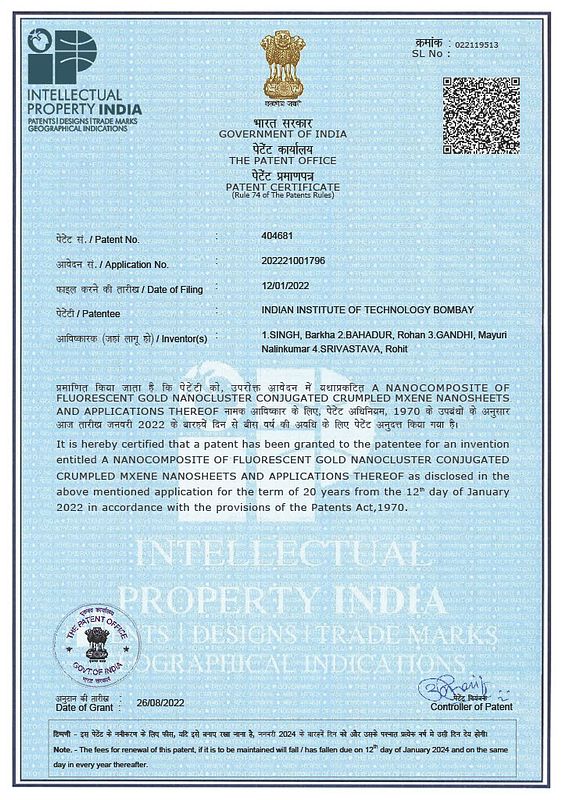 Barkha Singh, Rohan Bahadur, Mayuri Gandhi, Rohit Srivastava. “A nanocomposite of fluorescent gold nanocluster conjugated crumpled MXene nanosheets and applications thereof” Patent granted: 404681, January 2022.