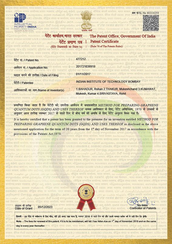 Rohan Bahadur, Mukeshchand Thakur, Mukesh Kumar Kumawat, Rohit Srivastava. “Method for preparing carbon dots (CDs) and uses thereof” IPA no. 201721038918 granted: 477212, December 2023.